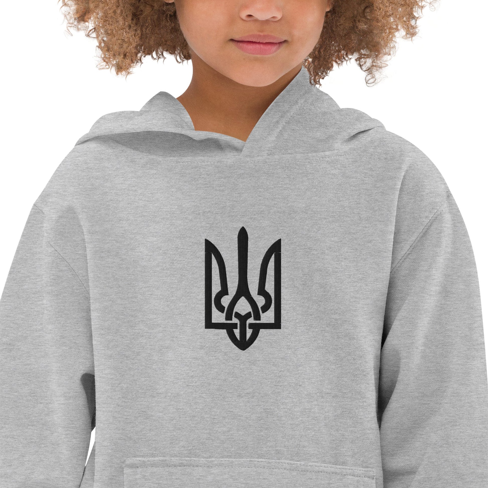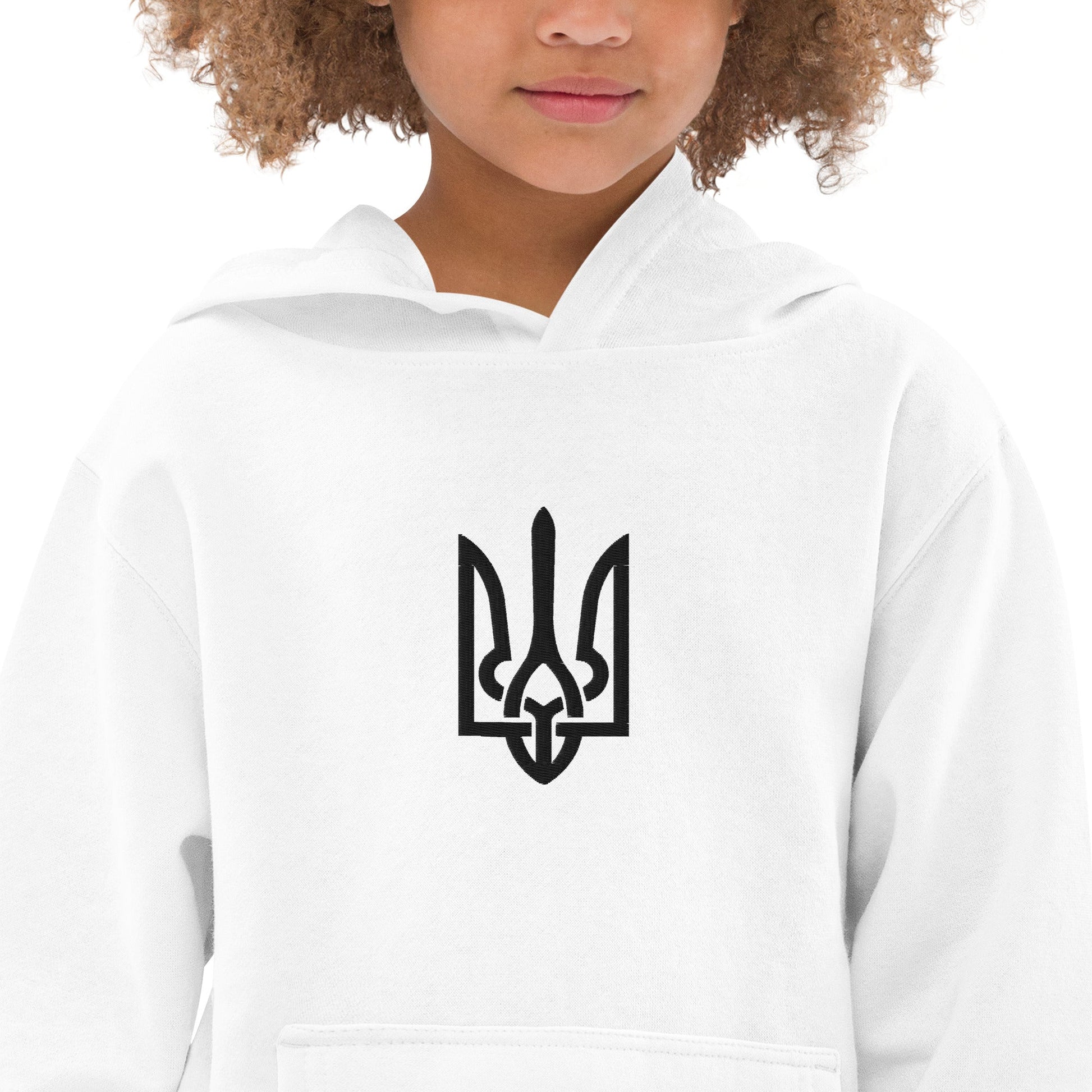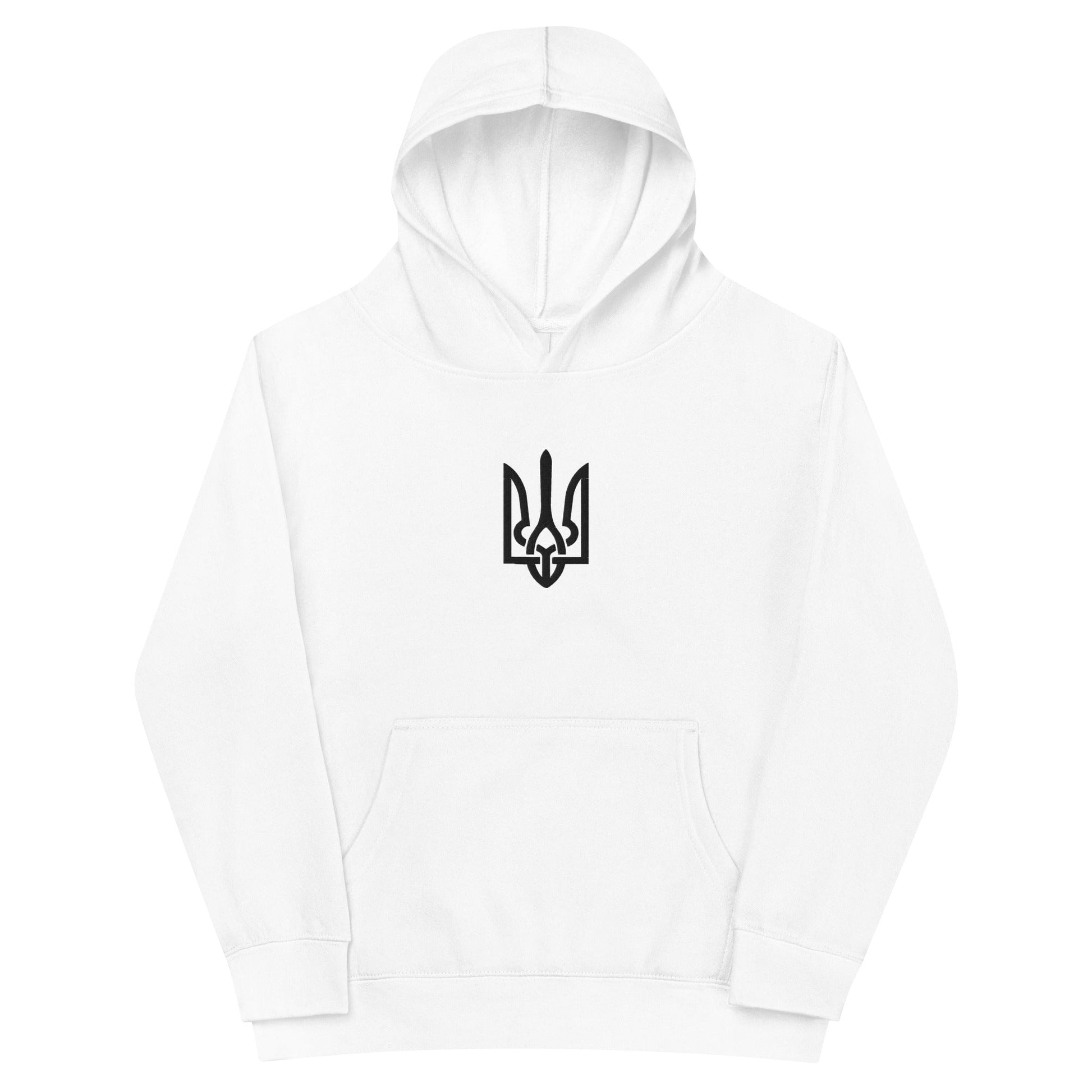 Keep your child warm and proud with this kids fleece hoodie featuring the Ukrainian Tryzub. Made from a soft cotton-poly blend, this hoodie offers a cozy feel with durable construction, making it perfect for school, play, or any adventure.