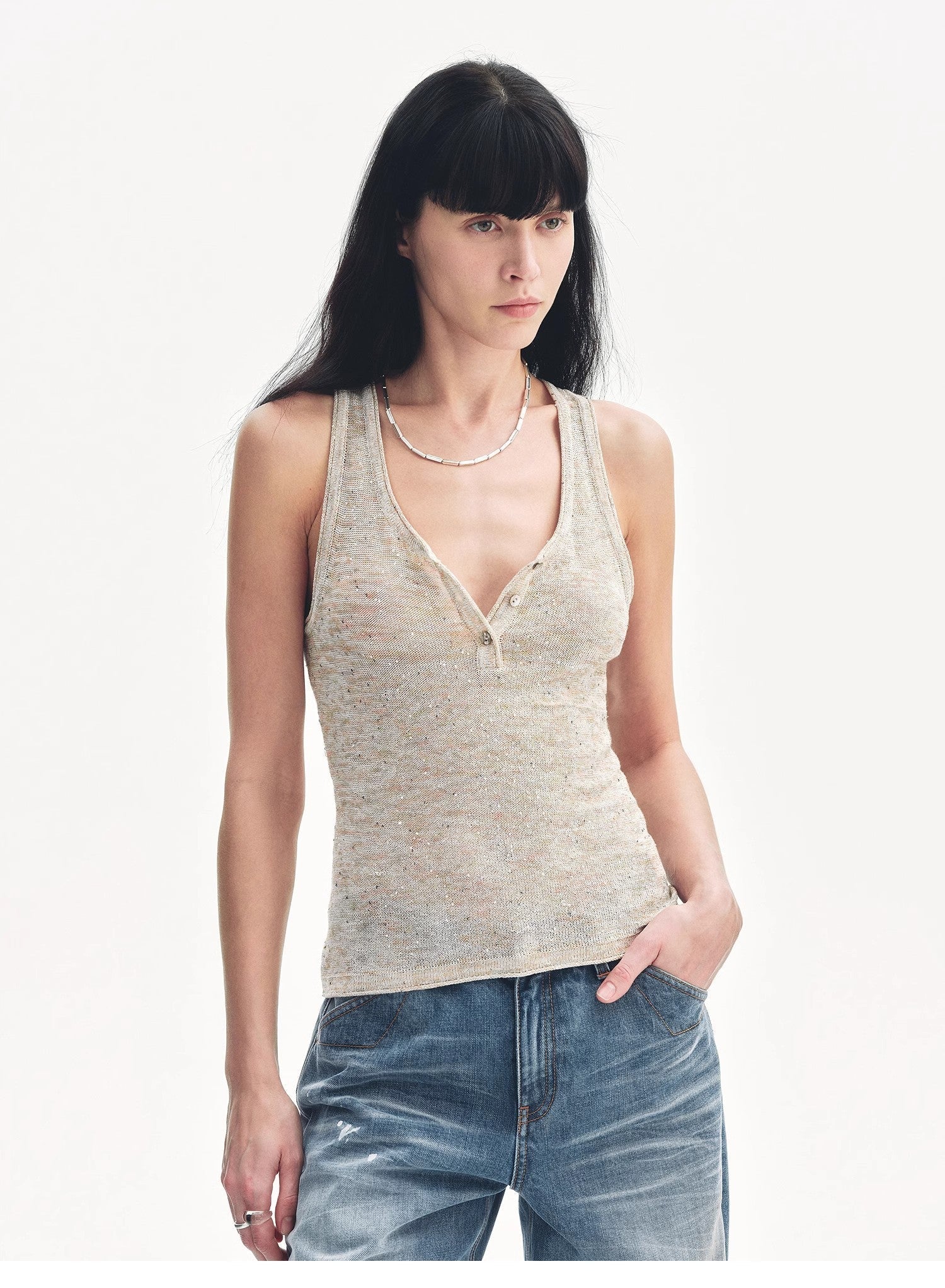 Meredelle captures the glow of a starry summer night — a play of light and texture, spun into a sleeveless silhouette. The Henley neckline brings casual structure, while gradient sequins shimmer like constellations across the soft cotton-linen knit. Its close fit follows the body with ease, lending itself to layered elegance or bare-shouldered charm.