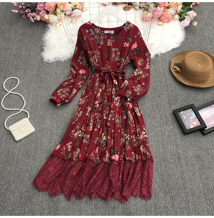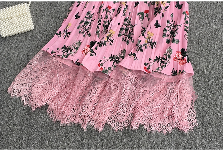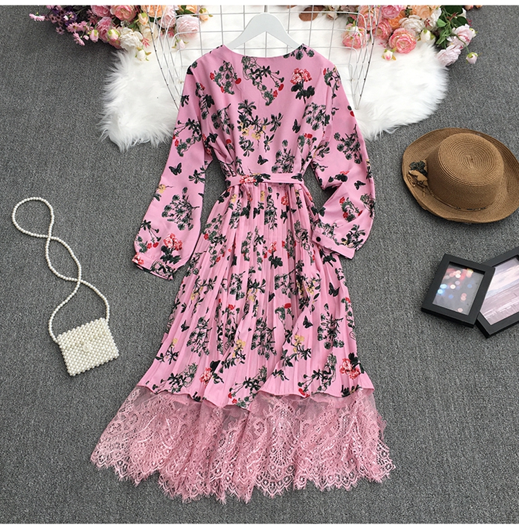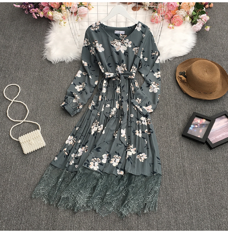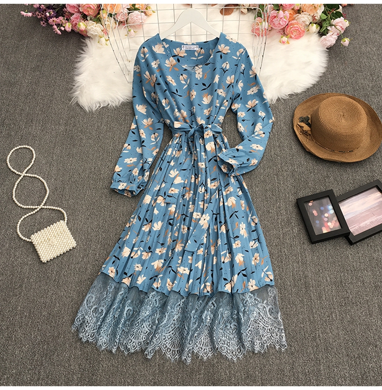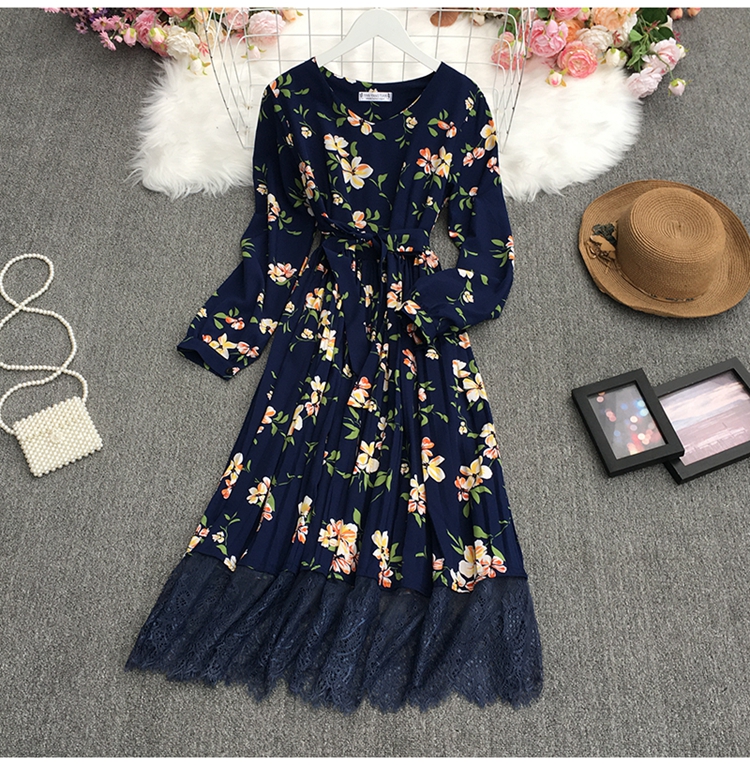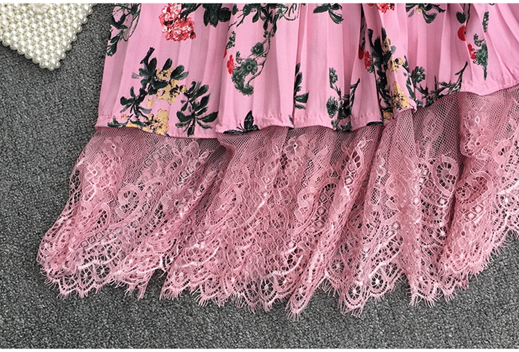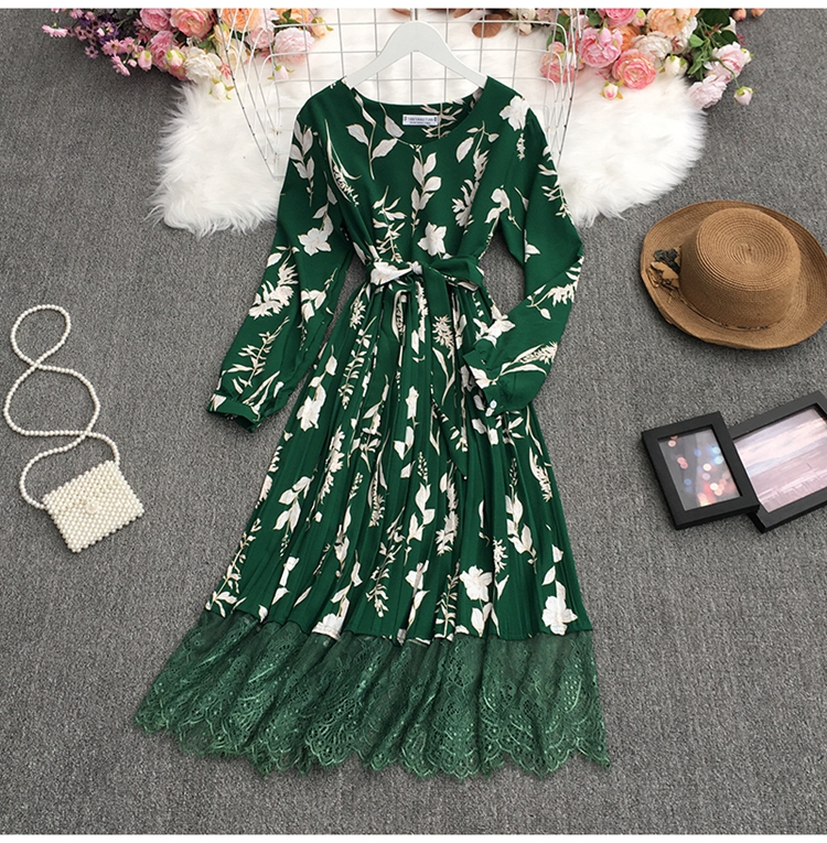 New French Women's Round Neck Slim Fit Pleated Lace Dress