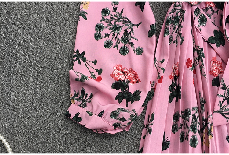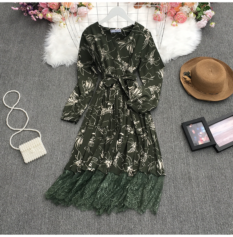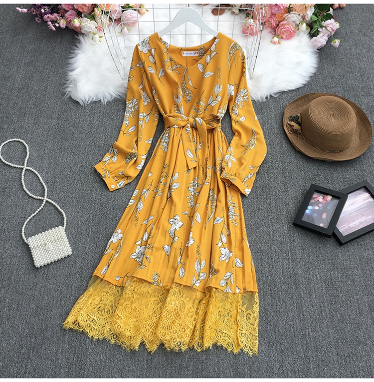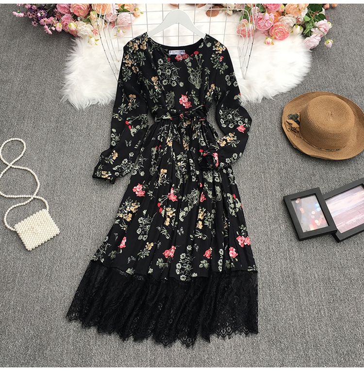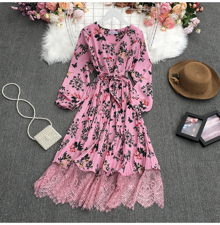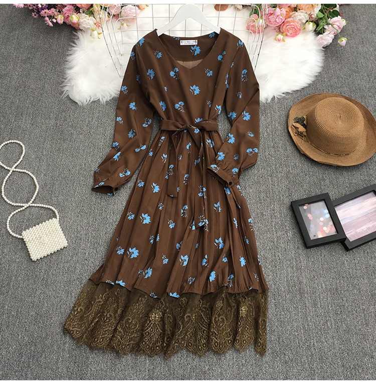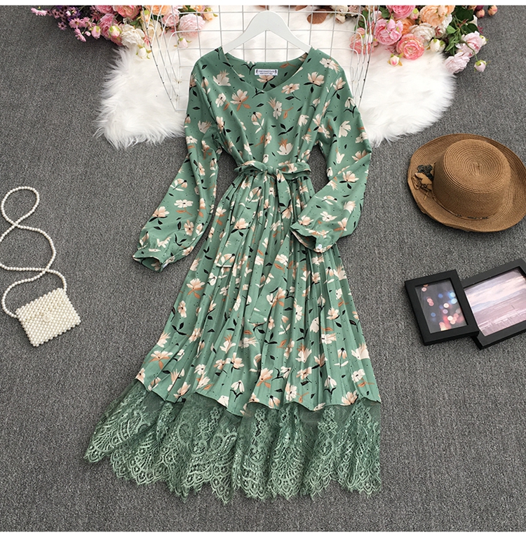 New French Women's Round Neck Slim Fit Pleated Lace Dress