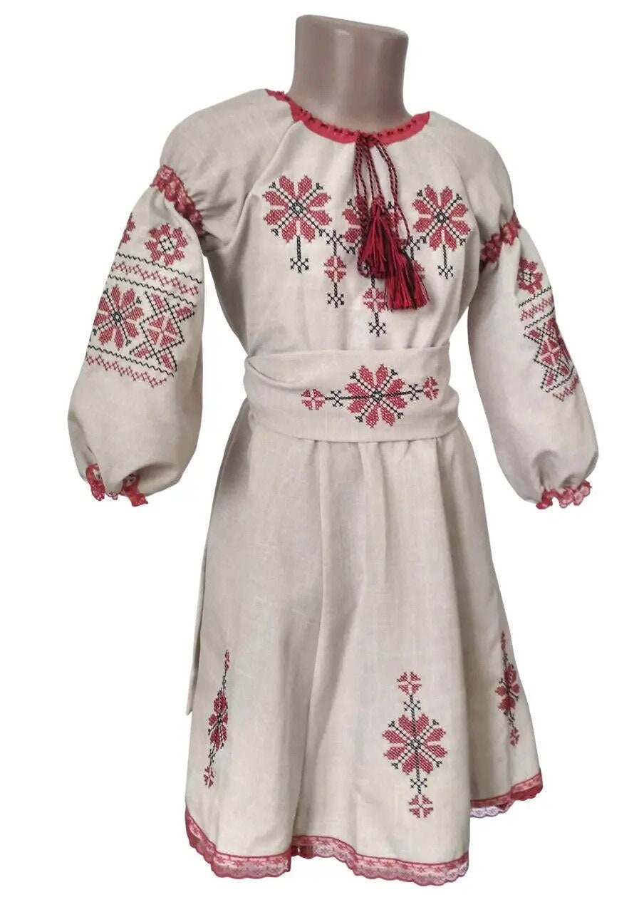 Ukrainian Embroidered Linen Dress with Belt for Girls – Traditional Vyshyvanka Outfit