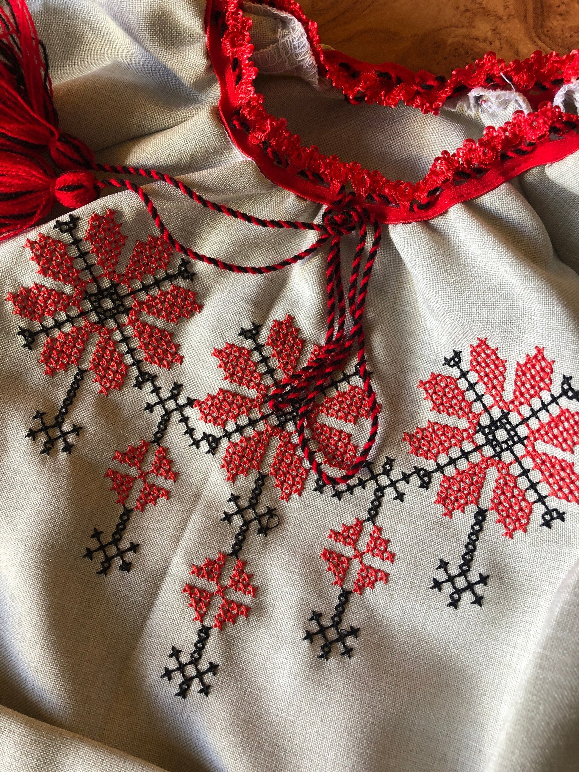 This elegant linen dress with a belt is a traditional Ukrainian outfit designed for girls aged 3 to 8 years. The dress features intricate red floral embroidery in a classic Rosava motif, adding a cultural and timeless touch to a modern silhouette.