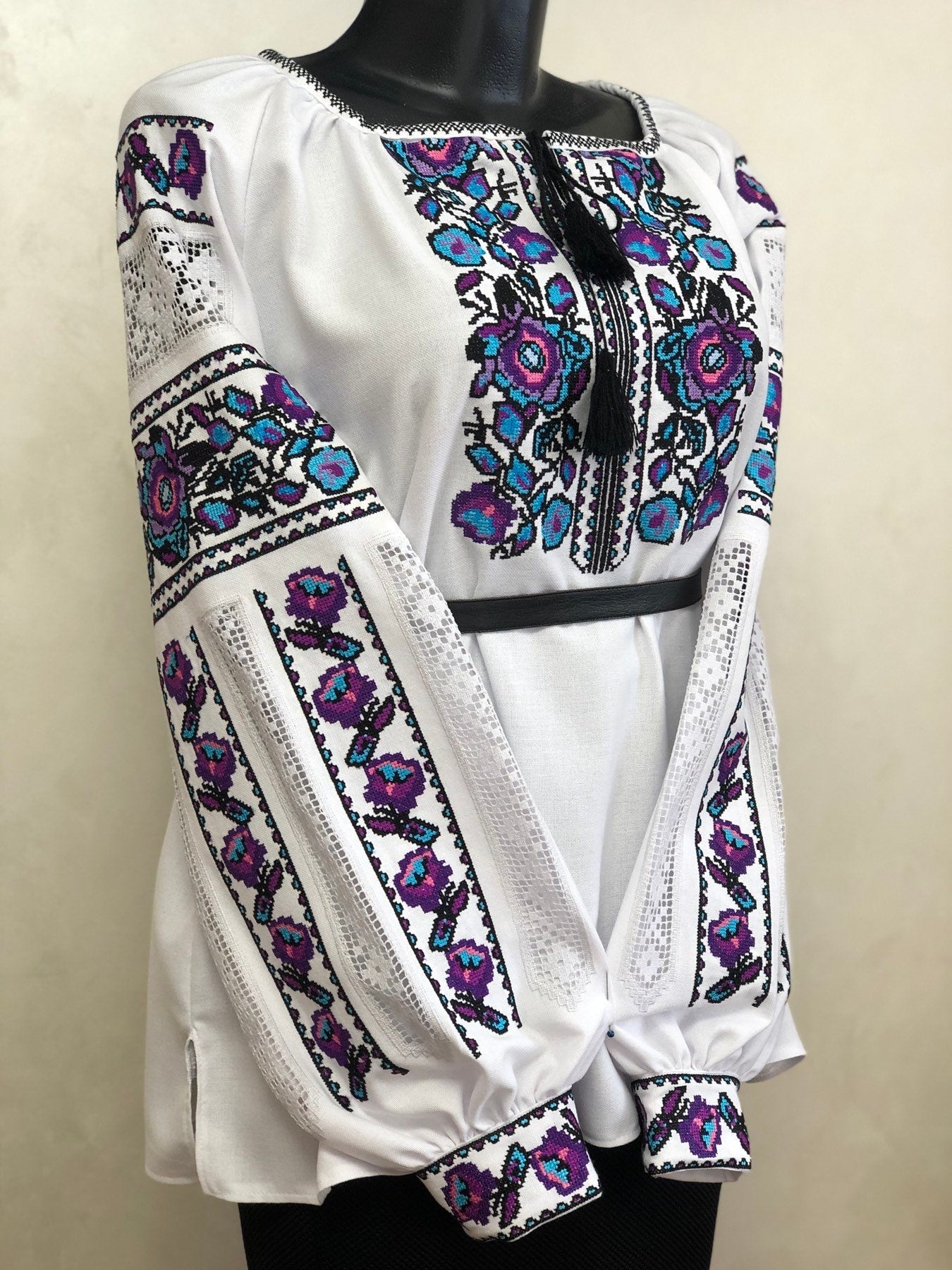 This women's embroidered blouse is crafted from natural white homespun fabric and adorned with traditional Ukrainian cross-stitch ornamentation. Inspired by authentic folk designs, the embroidery is made using a machine technique with delicate silk threads.